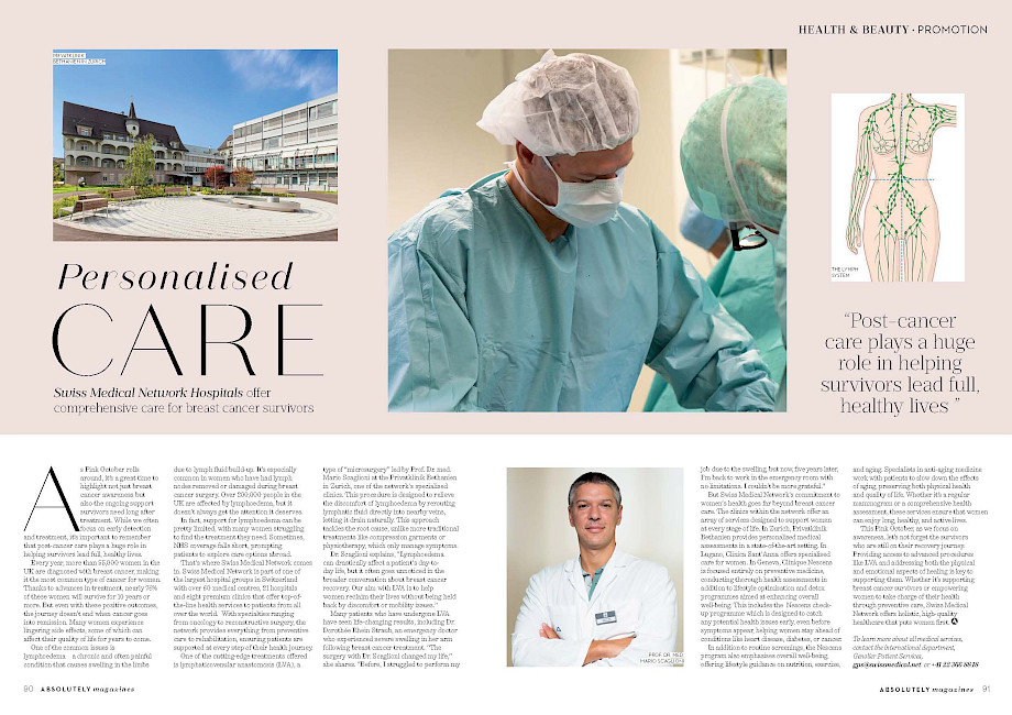 Die Privatklinik Bethanien bietet eine neue, hochspezialisierte Behandlungsmethode für Patientinnen mit Lymphödem an. Unter der Leitung von Prof. Dr. med. Mario Scaglioni wird die sogenannte Lymphatico-venöse Anastomose (LVA) durchgeführt – ein mikrochirurgischer Eingriff, der Lymphflüssigkeit direkt in die Venen leitet und somit das Lymphödem nachhaltig reduziert.