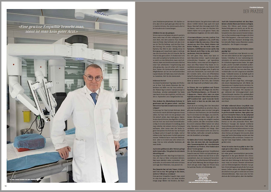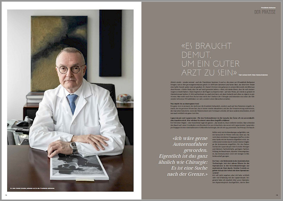 For the December issue of the Magazin Zürcher Bahnhofstrasse, the Medical Director of the Privatklinik Bethanien, Dr Daniel Christen, gave an interview. His speciality is visceral surgery and among other things he has specialised in operating with the «Da Vinci». He met the editor-in-chief of the magazine, Larissa Groff, for an interview. Dr Christen talks very openly about his career, the moments that have particularly touched him in his career and his original professional dreams: