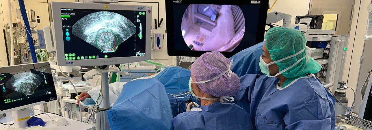 Radiofrequency ablation of myomas under transcervical ultrasound guidance (SONATA®System) has been available in Switzerland since 2017. Under anaesthesia, a probe is inserted into the uterine cavity so that the myomas can be localised and treated by heat. The treatment usually takes only a few minutes per myoma. The heat treatment shrinks the myomas in the following weeks and months. After three months, experience shows that 90 per cent of the bleeding problems have been reduced.