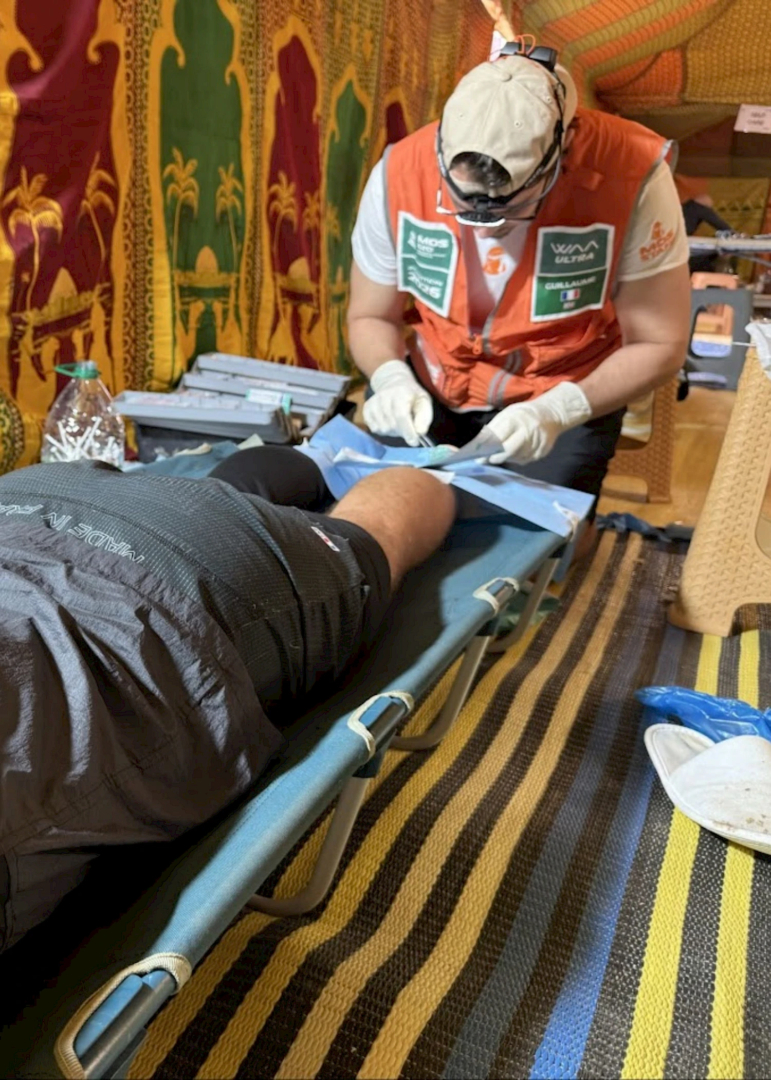 After the race, the medical commitment continued at the hotel with a clinic dedicated to post-race care, in an atmosphere mixing fatigue, relief, pride and emotion.