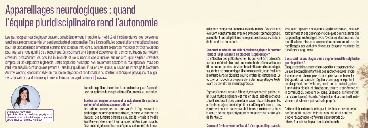 Dans sa dernière parution, le magazine Salle d’attente met en lumière les nouvelles consultations pluridisciplinaires dédiées aux appareillages, mises en place à la Clinique Valmont par la Dre Audrey Weaver, spécialiste FMH en médecine physique et réadaptation.