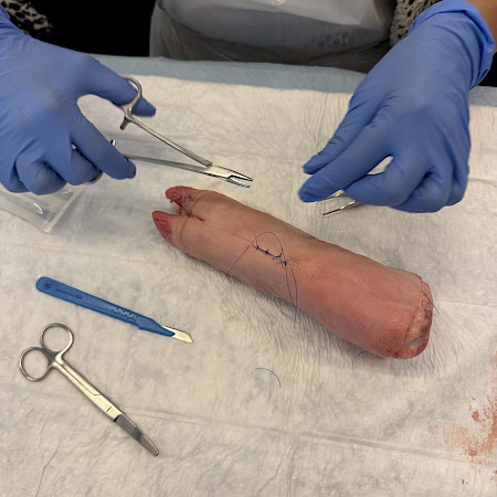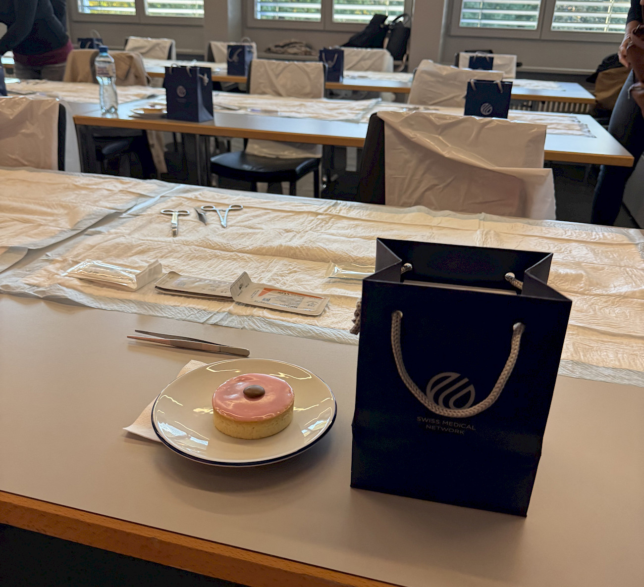 Dank der grosszügigen Unterstützung von Johnson & Johnson MedTech wurden wir mit originalem Nahtmaterial versorgt. Die Teilnehmenden konnten an Schweinefüssen verschiedene Nahttechniken kennenlernen und praktisch üben – begleitet von anschaulichen Video-Tutorials und der fachkundigen Anleitung von Dr. med. B. Baumgärtner und Dr. med. V. Steffen. So konnten die MPAs ihre Fähigkeiten direkt vertiefen und wertvolle Tipps für die Praxis erhalten.