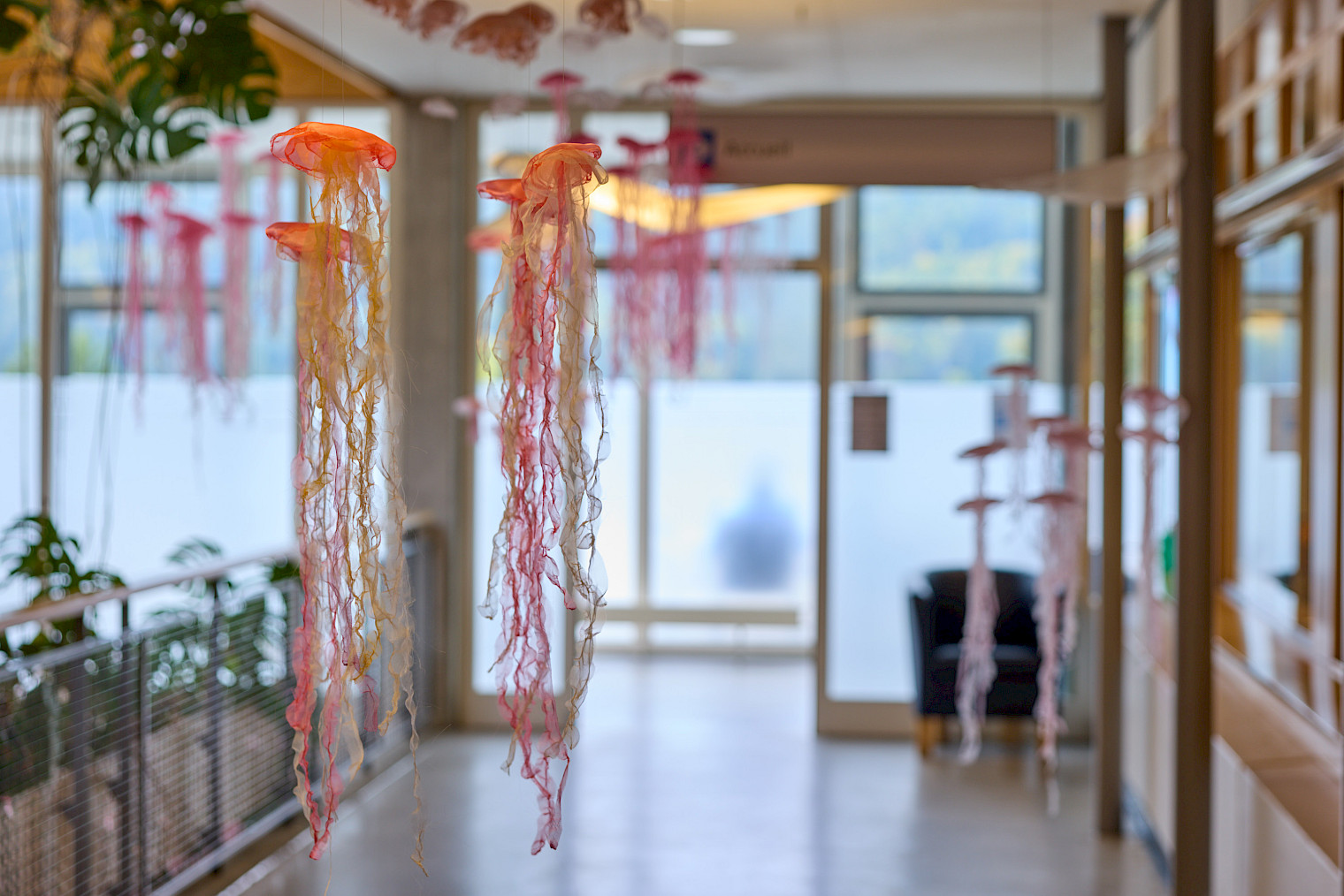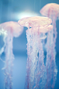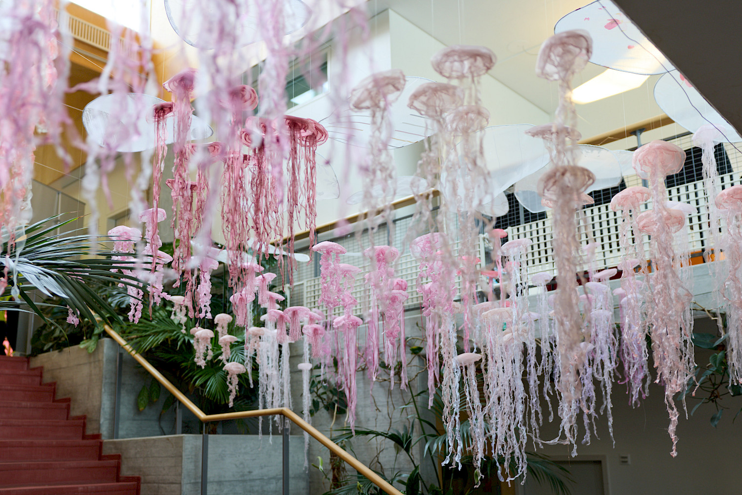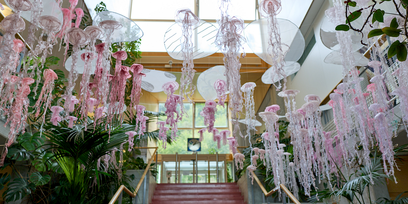 Des centaines de méduses en organza, délicatement suspendues, flottent dans l’air et s’animent au moindre souffle.