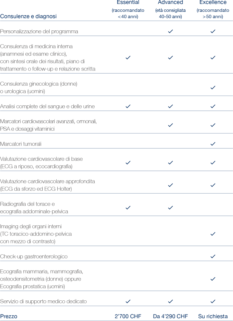 Offriamo diversi programmi di check-up standardizzati che possono essere ulteriormente personalizzati per soddisfare le esigenze individuali.